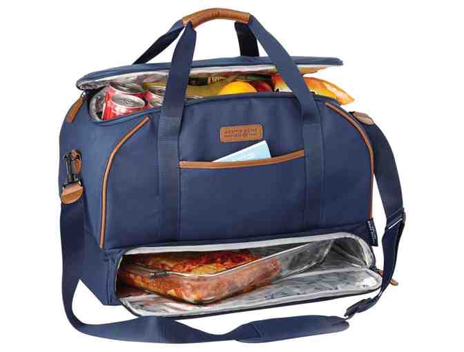 The Food Pro™ Domed Party Cooler has a 50 can capacity and is a great way to transport hot or cold food to parties, picnics or potlucks. The cooler features 2 compartments with SuperFoam® insulation plus Therma-Flect® radiant barrier that will keep food hot or cold and an Ultra Safe® leak proof interior lining. The top compartment has loads of space for food and drinks and the bottom compartment fits a 9” x 12” baking dish and has a zippered, drop-down opening for easy access. For convenience, the cooler can be carried by its handles or by the removable, adjustable shoulder strap.