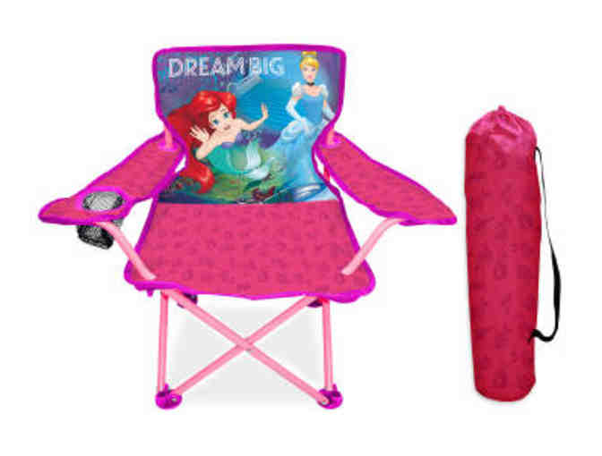 The Disney Princess heart strong fold N’ go chair has colorful character graphics and is great for indoors or outdoors. Sturdy metal tubular construction. Folds for easy storage & comes with its own carry bag. Each chair has a safety locking mechanism. No assembly required.