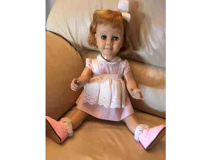 Chatty Cathy was born in 1959. Though nearly 60 years old, she looks as young as ever. Doll is in perfect condition, box has aged 59 years. Parents who recall driving your parents crazy with Cathy's constant chatter, do not despair! - this Cathy no longer talks. Generously donated by Chris Byrne.