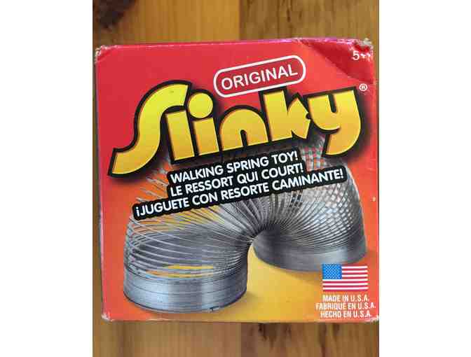 Original packaging, old fashioned, Vintage original style metal Slinky. Generously donated by Chris Byrne.