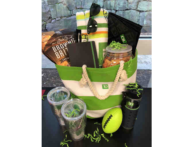 Enjoy some tasty snacks and beach items including Brownie Brittle, Snack Mix and the following TD Bank items: canvas tote bag, reusable shopping bag, 2 travel tumblers filled with lollipops, water bottle, sunglasses, towel, small foam football, carabiners, a pen and notebook and nail files.