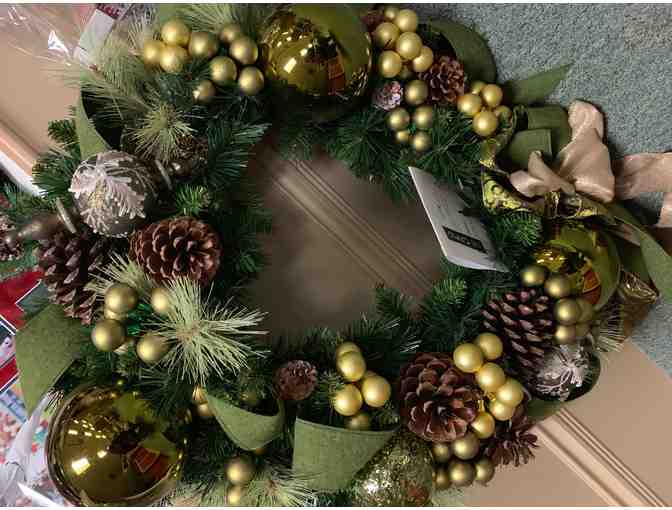 A beautiful, hand-crafted wreath, complete with large statement ornaments, beautful green and silvery ribbon, and delicate pine cones.  A breathtaking statement piece for any entranceway, foyer, or above the fireplace.