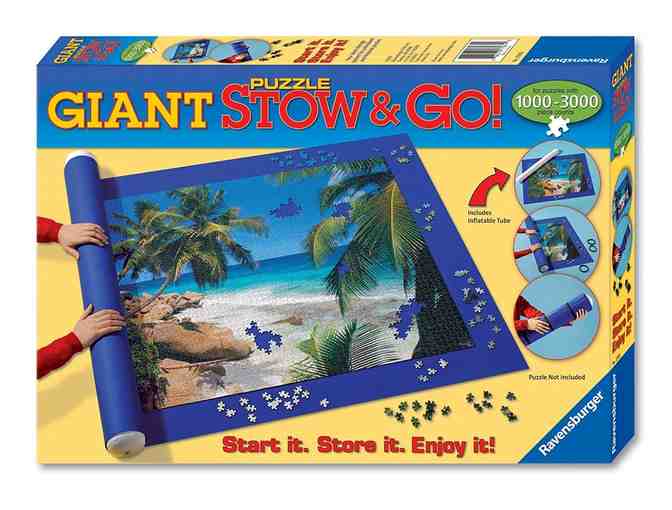 The Giant Stow & Go lets you go virtually anywhere with your favorite puzzle in tow. A felt mat for increased grip, the inflatable tube, and three rubber bands give you the flexibility to take puzzles wherever you travel. Take them on the road to grandma's house or check them on the plane so you and the kids can relax and work on a puzzle during vacation.