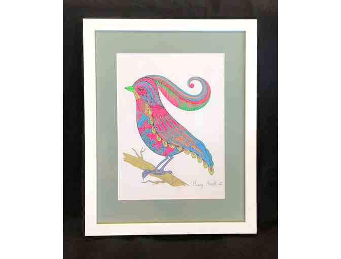 A beautiful picture of a bird perfectly colored by SORI Athlete Henry Moretti III and professionally framed courtesy of Providence Picture Frame.