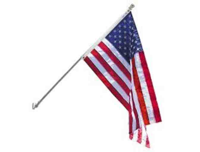 Display this U.S. flag with pride. Measuring 3' x 5', it comes wiith a 1" cast aluminum multi-position adjustable bracket and 6 ft. spinner pole.