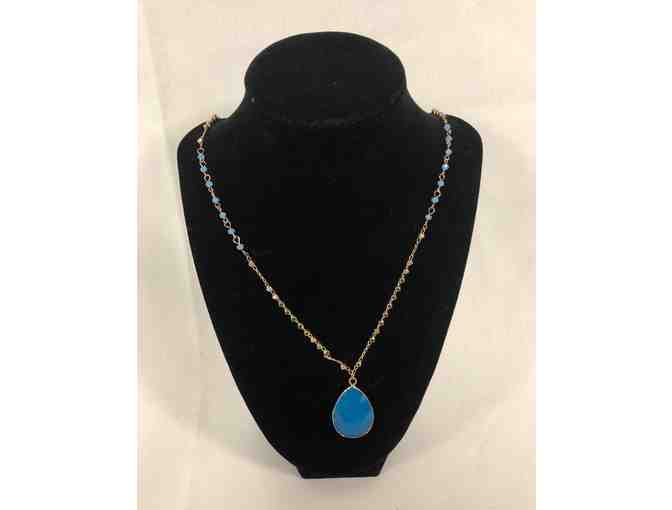 This necklace has a turquoise blue pendant on a long chain. A great Statement piece!