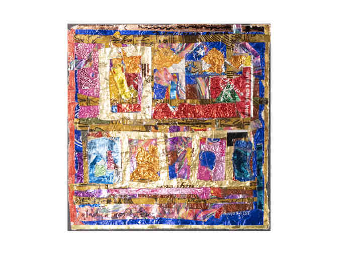 You are bidding on a small, approximately 3-1/2" X 3-1/2", unframed collage in gold and deep jewel colors created from candy wrappers. Gladys Hack Goldstein (1918 -2010) was an abstract painter inspired by nature, who used light, layers, and glorious shapes to convey what was always bursting to be expressed. Mrs. Goldstein studied in Mexico, Santa Fe, and many other places, but she was born, lived most of her life, and produced her largest body of work in Baltimore. She spent her whole life drawing, painting, making paper, creating mixographias and collages, and sculpting because it was her life's calling--it was in her DNA. Her work is in many public and private collections throughout the United States and Europe. The University of Maryland University College exhibition in 2004, "Capturing the Essence: The Art of Gladys Goldstein," celebrated the opening of the Gladys Goldstein Gallery in the UMUC Inn and Conference Center. This gallery is the university's first permanent display of contemporary abstract art.