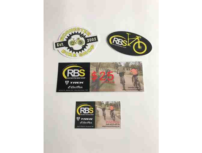 Rochester Bike Shop $25 Gift Card with a stickers and decal.
