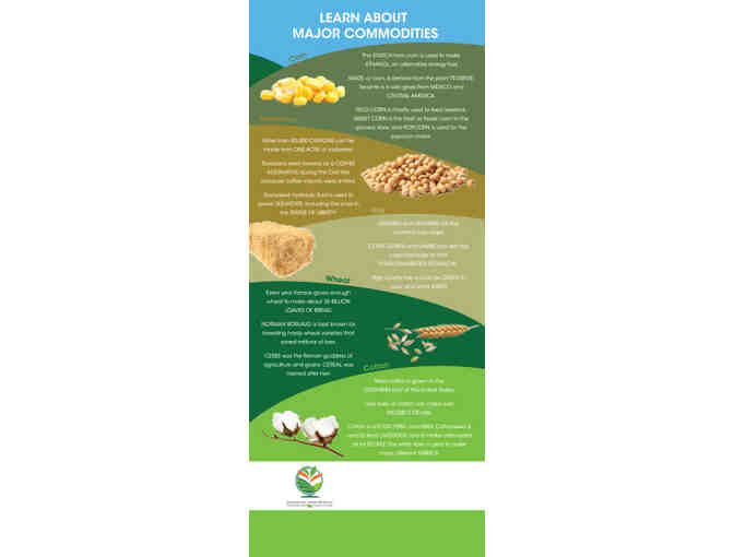 13 Oz. 36" x 78.5" Smooth Vinyl single sided vertical banner with grommets in each corner and center on top and bottom. 9 piece set includes horse, beef, dairy, swine, sheep, goat, and poultry banners, along with major commodities and specialty crops.
