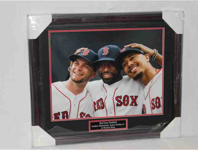 A professionally framed and matted color 16 x 20 image, with laser cut matting and glass of the "Boston Red Sox Outfield" with Andrew Benintendi, Jackie Bradley, Jr. and Mookie Betts.