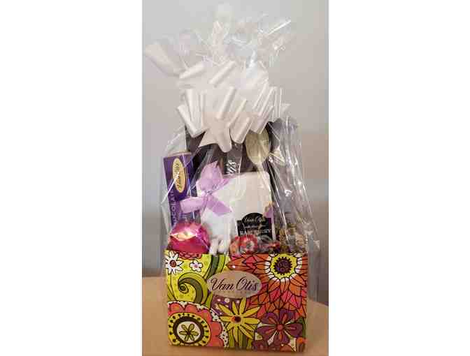 Gift Basket from Van Otis Chocolates which includes 2 chocolate bars, a box of assorted chocolates, a box of raspberry creams, and several assorted candies.