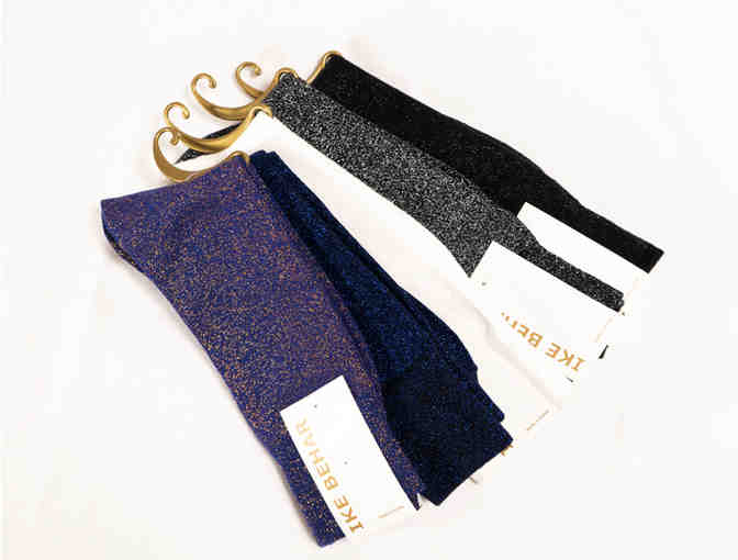 Five pairs of socks woven with metallic lurex, these mid-calf socks are made from a cotton blend with ribbed top and added stretch for comfort. They are men's socks but we see them as gender neutral. Colors are white, black, black with blue, gold, and navy with an orangy bronze; sock size 11-13.