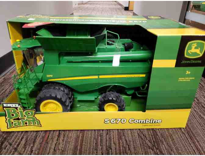 The Big Farm Combine S670 is just like the real thing only smaller! Has working cab lights, detachable grain head, and removeable front outside dual wheels. This super cool combine allows kids to play for hours. The feeder housing raises and lowers, right side body panel opens, and it has steerable rear wheels. Fun for even the big kids!