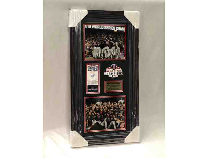 2018 Red Sox Wrold Series 2-way celebrating the 9th Championship! Two 8 x 10 images with replica World Series Logo & Game Ticket. Overall size is 16" x 31".