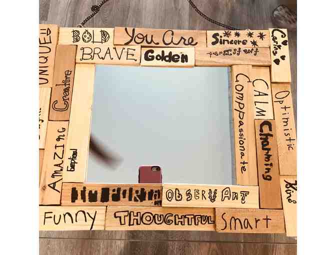 The children chose uplifting words to describe how great they are and wrote it in their own unique way on a piece of wood. Those pieces come together around their reflection. Approx size 18" X 24".