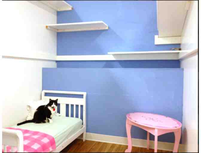 This certificate is good for two nights of boarding for up to two cats in one room at this amazing kitty hotel (cage free). Every guest or family of guests, is given their very own private room and is visited multiple times a day by our adoring Kitty Worshippers, for free. No lonely kitties here!