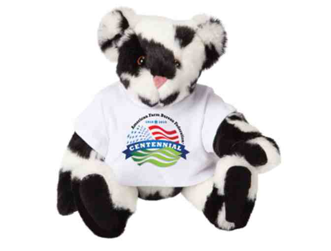 This charming jointed "Holstein" bear, is udderly outstanding in the field of cuteness. Made by the Vermont Teddy Bear Company, in partnership with Vermont Farm Bureau, to celebrate AFBF's 100th birthday. It is a 15.5 inch fully jointed bear using the softest fur we can get our paws on. It has a life time guaranty and is hand made in Vermont. The bear sports a tee shirt with the AFBF centennial logo on it!