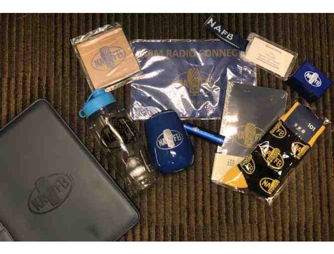 The NAFB Gift Basket includes a leather folio, coaster, notebook, socks, tumbler, waterbootle, portable speaker, portable phone charger, lanyard, and cloth cleaner.