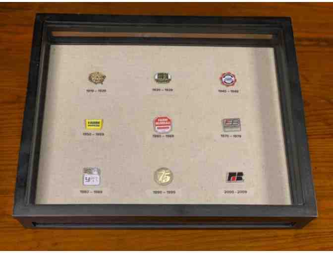Proudly display you're "Farm Bureau Proud" with this beautiful commemorative centennial pin set and glass display case provided by Farm Bureau Bank. This pin set is a great collectors item and features pins that represent key milestones during the first 10 decades of Farm Bureau! Take a trip down memory lane with logos dating back to the 1919 through today! The set will feature the 9 pins displayed here, plus this year's centennial pin, and will be shipped to the winner upon confirmation of the winning bid.