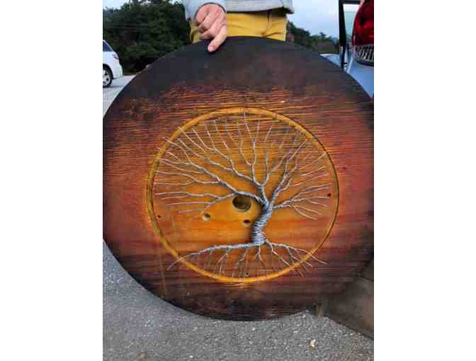 This unique piece features a beautifully crafted tree with carefully spaced branches arching out in a semi-circle and roots reaching down and outwards... all secured to a repurposed, circular piece of wood naturally streaked with light and dark tones.