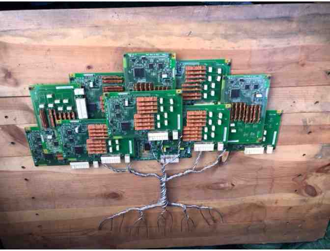 This unique piece features a cleverly crafted tree with "leafy" branches fashioned from recycled circuit boards and a twisty wire trunk and roots and secured to a repurposed, rectangular-shaped stack of boards. Perfect for that start-up app developer's office, computer engineer's den, or your artsy-computer wizard kiddo's bedroom!