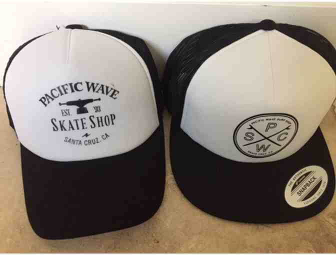 This item includes 2 trucker-style hats from Pacific Wave Surf Shop in Santa Cruz.