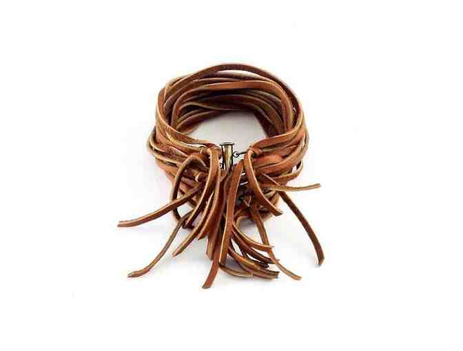 A personal favorite of the designer, this badass cuff is so soft and comfortable, you won't want to take it off. 20 strands of deerskin leather wrap around to an antique-brass magnetic sliding clasp.