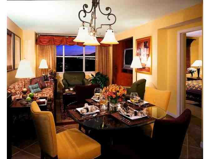 Enjoy 8 days and 7 nights in a 2 BR unit for up to four people. The Grandview at Las Vegas is your Oasis in the desert. While the weather is hot, lay out on the large sundeck by one of the four pools, one with a rock waterfall, located throughout the property. Exercise in the fitness room or play some games in the video arcade. The Grandview is a family oriented resort which is located adjacent to the South Point Casino which has several restaurants, movie theaters and a bowling alley. The resort offers a limited shuttle service for an additional fee. These spacious 2 Bedroom suites include full dining and kitchens areas. The living rooms and bedrooms both offer a TV, while the living rooms feature DVD/VCR combination players and complete audio systems. In addition, guests will appreciate the magnificent view of Las Vegas from their private balcony. Decorated in a desert sunset motif, Grandview at Las Vegas has 1-bedroom units that sleep up to four guests and 2-bedroom units that sleep up to eight. All accommodations feature full kitchens with refrigerators, ranges, dishwashers, microwaves, and a washer and dryer.
