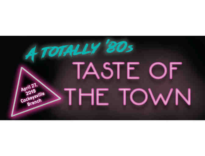 Two tickets to the 8th Annual Taste of the Town, an event to benefit Foundation for Baltimore County Public Library. The theme is Totally '80s, and if you want to, it's the perfect time to rock your favorite fashions! The event is Saturday, April 27 from 7 pm -11 pm at the Cockeysville Branch library. Enjoy sampling food and beverages from area restaurants and caterers, live music from New Romance, casino games and an eclectic silent auction. All proceeds benefit library programs and projects. Check out the details at Taste of The Town.