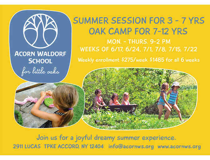 One-week session at Acorn Waldorf School's Summer Camp. Every week we play in meadows, climb trees, build and dig in the sandbox, make beautiful crafts, take nature walks, run thru the sprinkler and spend time with good friends, or simply enjoy summertime laziness… come join us!