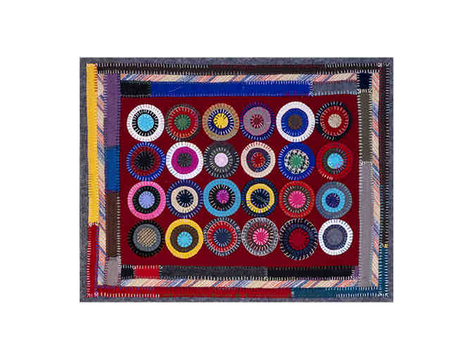 Shamelessly dynamic, rhythmic, and methodically crafted, Loring fuses venerated practices and innovative design, manipulating color, shape, and dimension in her appliqued compositions. Loring's design aesthetic is unabashedly bold, kinetic and playful, emerging from bags of scraps abandoned on her porch, or scavenged from flea markets and yard sales. Using various needles and threads on hand-cut felt pieces amplify the visual freshness, enthusiasm and sophisticated naivete trademark in her work that grace many homes throughout the Mid-Atlantic region. This unframed piece, Scrappy 24, consists of hand cut and embroidered appliqued 3-layer disks on a scarlet woolen background with a triple border. It measures 23" x 18".