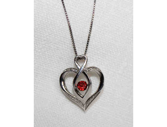 This scrolling heart .925 pendant necklace is accented by a shimmering center stone?, with a single clear gemstone accent. A unique hinged setting allows the center stone to pivot within its frame, creating the effect of dancing light. The slightest movement brings this exciting stone to life.