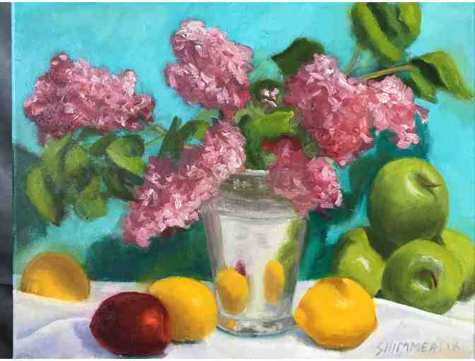 "Lilacs with Fruit" oil painting by Susan Shimmerlik