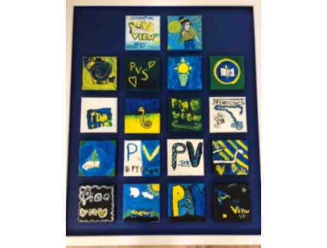 This art piece was created by the eighteen students in Lisa Rader's Fifth Grade classroom. Each student was asked to paint a small square canvas with images related to Pine View. Using primarily the two school colors, they painted everything from fellow students to textbooks, pythons to pine trees. We hope you enjoy this unique "collage' of student artwork.