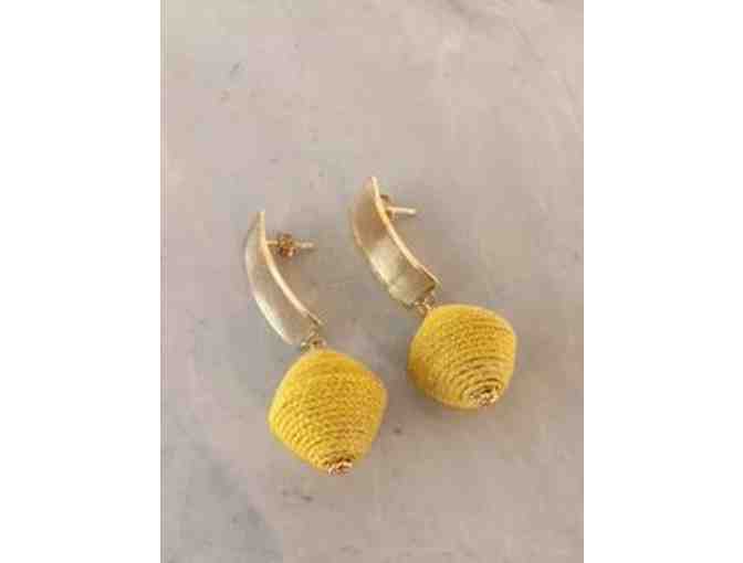 Mae Earrings (2" long) are handmade raffia-wrapped bead on a gold-plated rectangle stud.