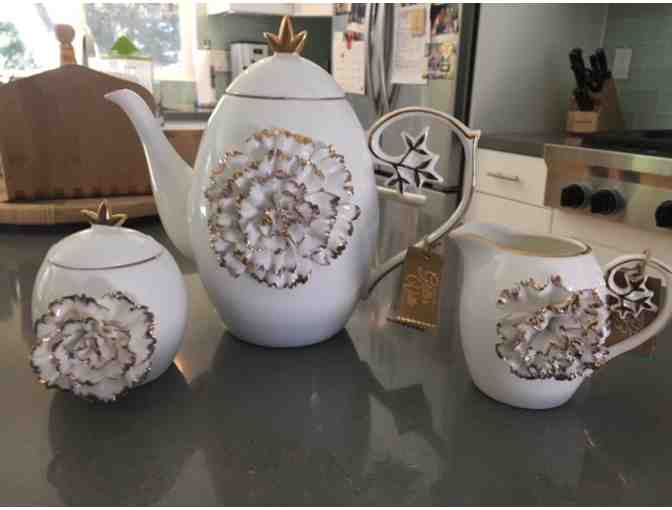Porcelain Dolly Poulet Tea Pot, Cream & Sugar Set from the collection made popular by Steven Brown and his Glitterville company. Gorgeously handmade, creamy white porcelain with raised flower detailing outlined in gold. Would be a great addition to your Easter or Mother's Day table setting!