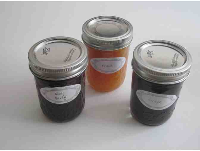 Three divine jars of jam from Chris Kochem's Belmont kitchen. No one will be late for breakfast as long as these preserves are on your table. Chris's superb selection includes: 1) Concord Grape (made with grapes grown right here in Belmont); 2) Peach (peaches from Kimball Fruit Farm or the Belmont Farmers' Market); and 3) Mixed Berry (native strawberries along with raspberries and blueberries).
