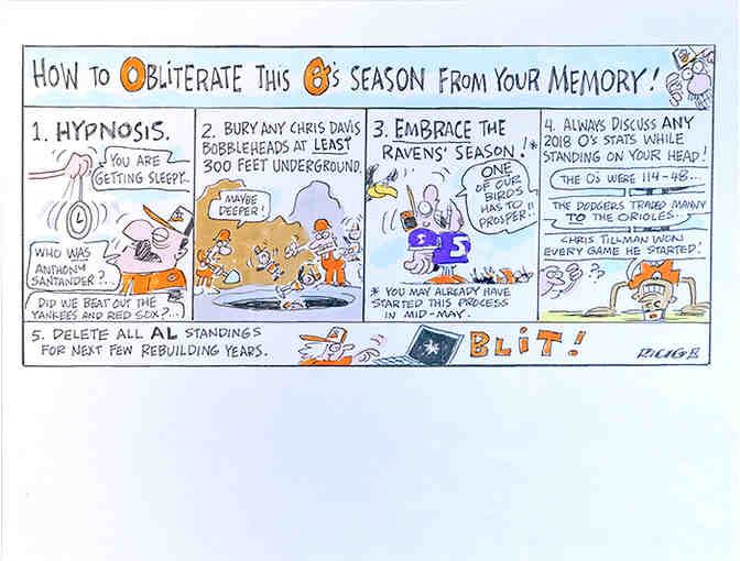 Do you need a reminder of how the O's did this year? Follow Mike's advice, as published in Pressbox, for ways to forget! Cartoon measures 8-1/2" x 11"