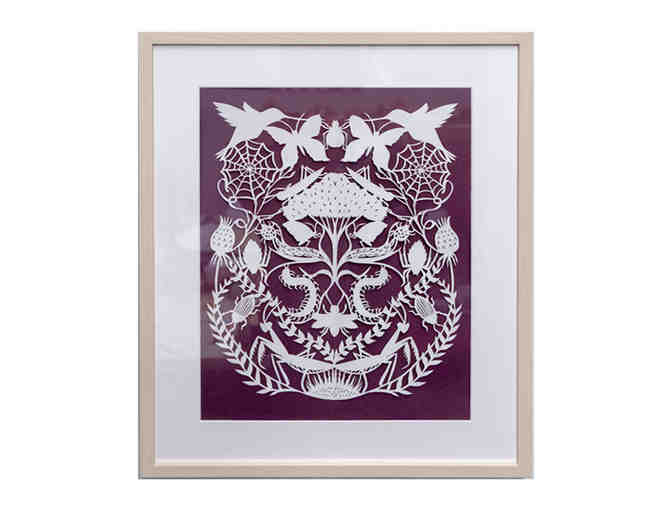 Dazzling and original, this one-of-a-kind papercut is mounted in a natural frame with a cream-colored mat on a cranberry background and ready to hang in your home. This unnamed piece quietly depicts a tree with natural images surrounding it and will fit beautifully in any environment. Annie Howe's papercuts are intricate, detailed, and cut with care; each piece tells a story. Image size is 11" X 15" in a 16" X 20" frame.