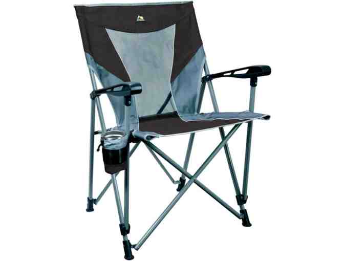 The GCI Outdoor Sports Chair is extremely comfortable with great support. With just one easy step, the Sports Chair quickly opens so you can sit and enjoy the game. It features hard armrests, mesh paneling on the backrest, and a wide tension seat. Includes adjustable beverage holder, carry bag, color black/gray.