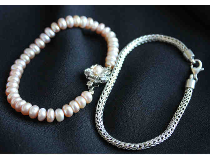 2. Approx 7.25" long Pink Button Pearl bracelet with silver plated floral shaped clasp.