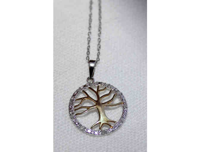 Round-cut diamond? accent pendant necklace featuring the tree of life. Crafted of .925 silver and 18k gold over sterling silver accents.