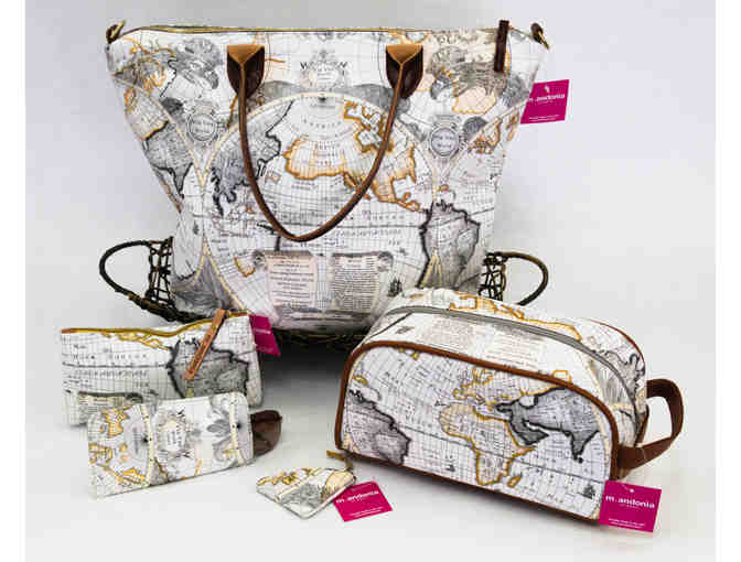 The "MAP" collection features a tote with a removable strap, mens dopp kit, cosmetic case , eyeglass case, and coin purse all detailed in leather.