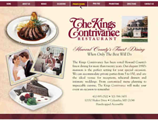 Enjoy an eclectic selection of menu items at this historic manor in Columbia. The Kings Contrivance has an extensive wine list and serves brunch, lunch, and dinner. Howard Magazine readers have voted The Kings Contrivance "Best Fine Dining" and "Best Ambiance."