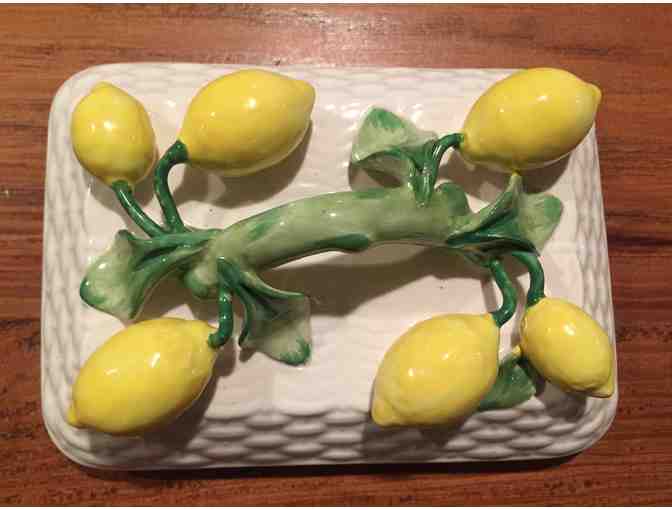 Tiffany & Co. white glazed ceramic basketweave pattern with applied lemons and branch. Made in Italy. Circa 1996.