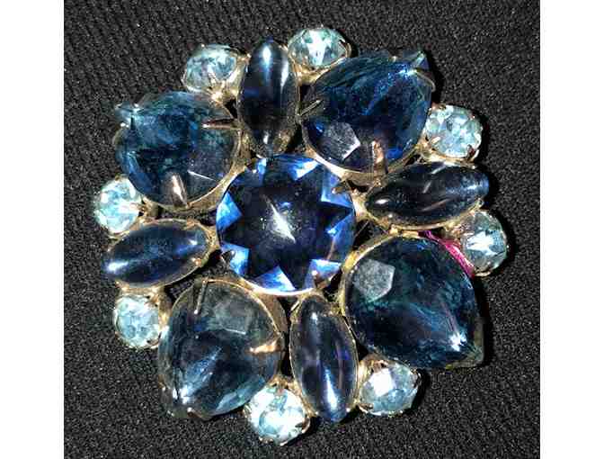 This antique brooch has various shades of blue rhinestones that dance in the light!