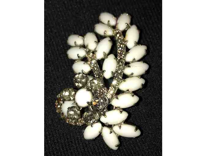 This antique set includes clip-on earrings and a brooch featuring classic rhinestones and white stones.