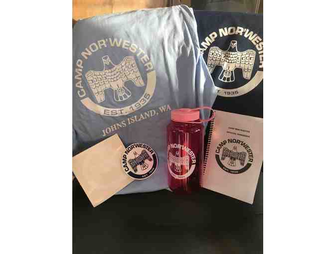 The perfect assortment pack of Nor'wester gear for your camper - or yourself! Includes a small songbook, tote bag, water bottle, t-shirt, window decal, and sticker.