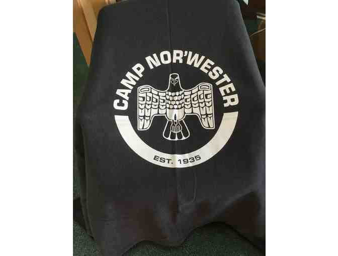Wrap yourself or your camper in the snuggly warmth of a Nor'wester sweatshirt blanket! Great for evenings spent around the campfire or cuddling on the couch. Blanket is dark gray and adult-sized, approximately 4 feet by 5 feet.
