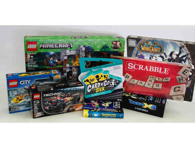 Unplug, build, play and read! This set of 9 is suitable for the whole family to enjoy. Items included are: Minecraft Bedrock Adventures Lego (644 pieces), Lego City Sea Rescue Plane (141 pieces), Lego Technic (139 pieces), MegaBloks World of Warcraft (213 pieces), Card'n'Go Seek, Scrabble, Mech-X4 Vision Goggles, "The Complete Adventures of Charlie & Mr Willy Wonka", "Supervillain Born To Be Good".